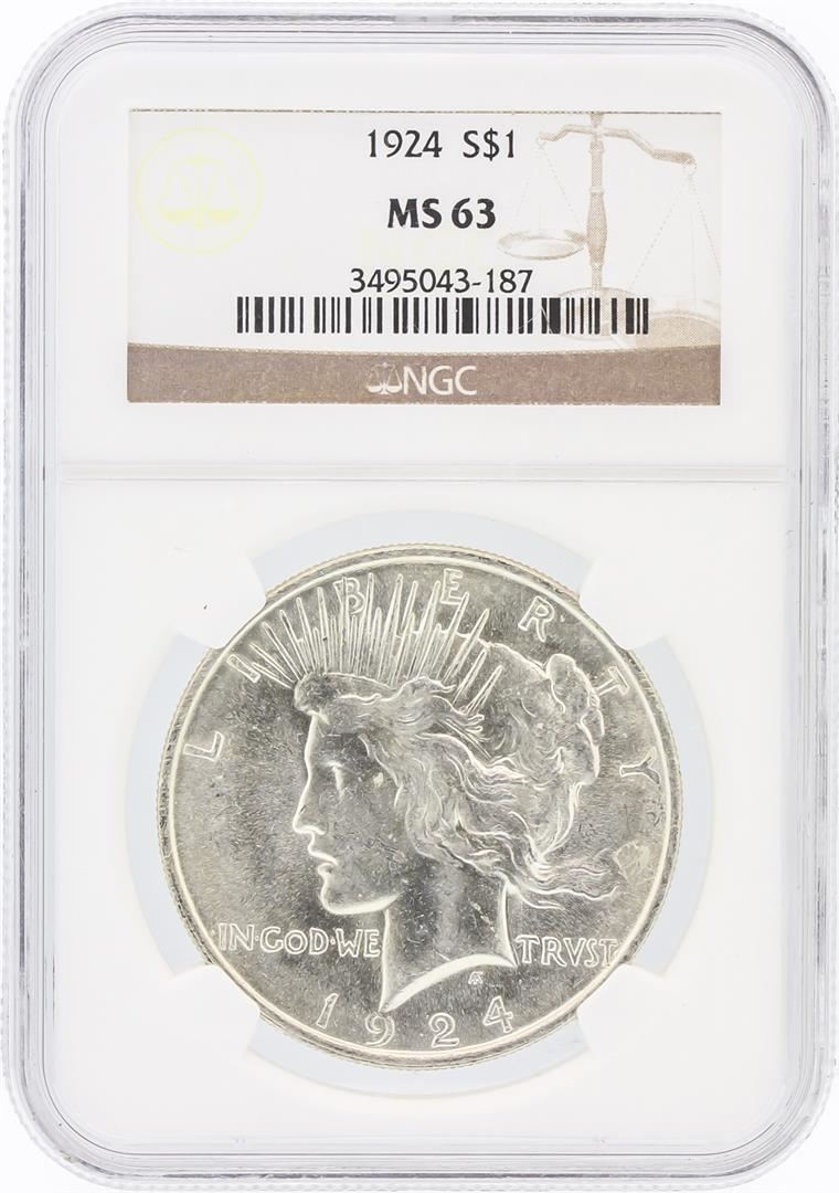 One 1924 NGC MS63 Peace Silver Dollar. NGC Certified.