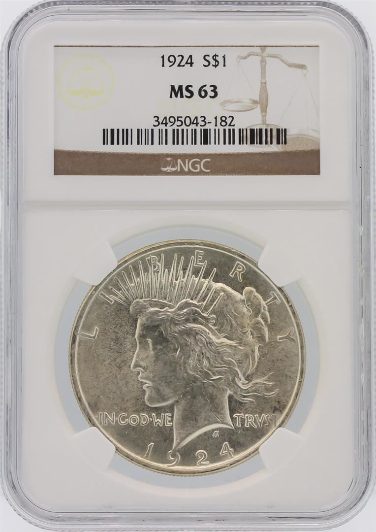 One 1924 NGC MS63 Peace Silver Dollar. NGC Certified.