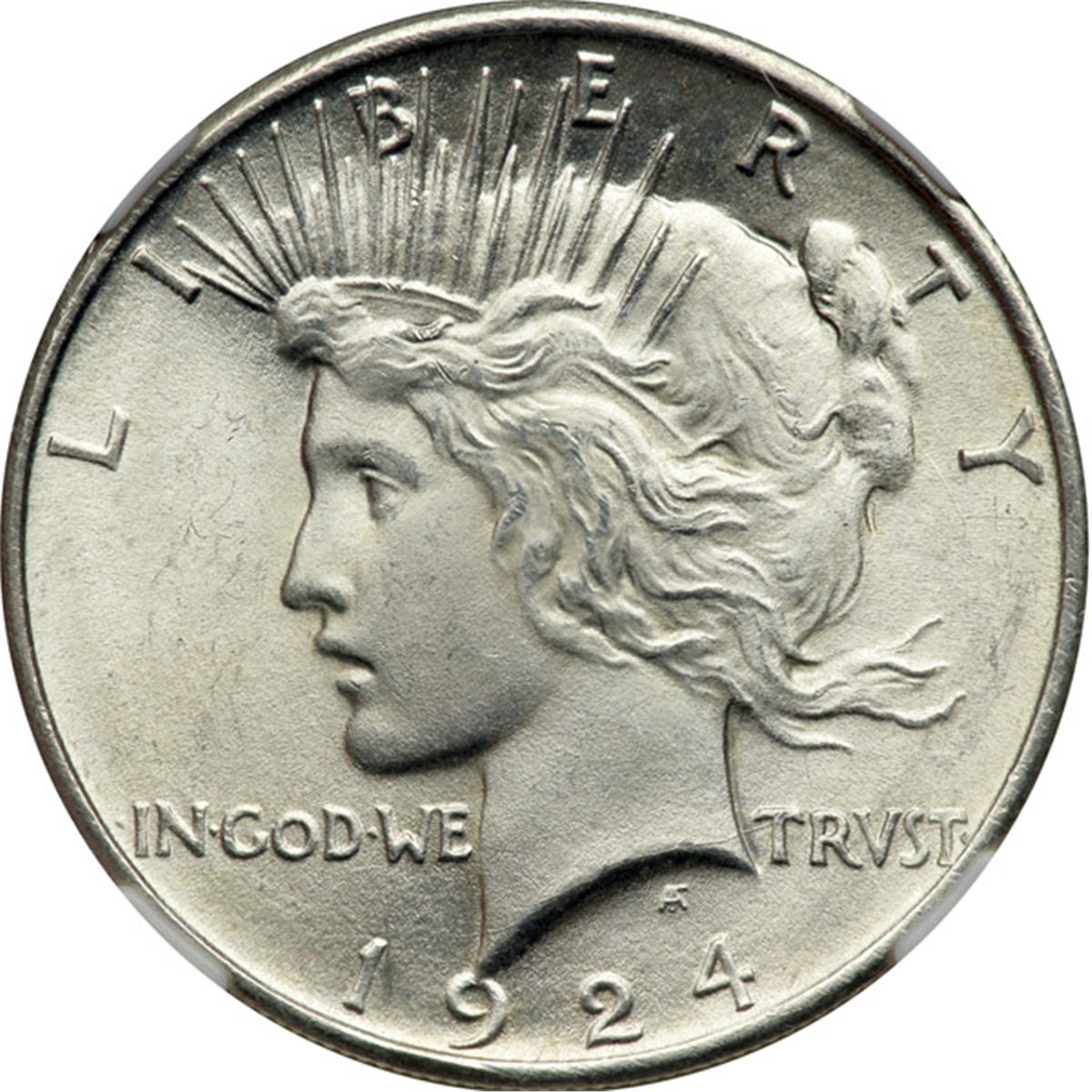 1924 Peace Dollar. NGC graded MS-66. Frosty and totally white. A generous amount of crisp detail for the date, including those areas with the usual weak metal flows into the deepest channels of the dies leaving the centers bold.