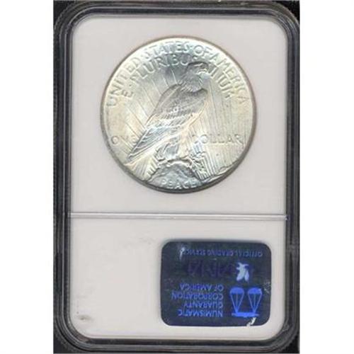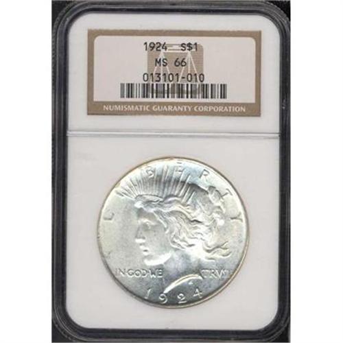 <b>1924 Peace Dollar. NGC graded MS66.</b> A lustrous example of this high mintage date, untoned and only mildly abraded; excellent silver color with the thick velvet-textured luster found on a portion of the mintage similar to the quality of luster seen on 1916 dimes, quarters and half dollars. The strike is strong, too, with clear definition to the high points. A solid gem <b>(PCGS # 7363)</b>