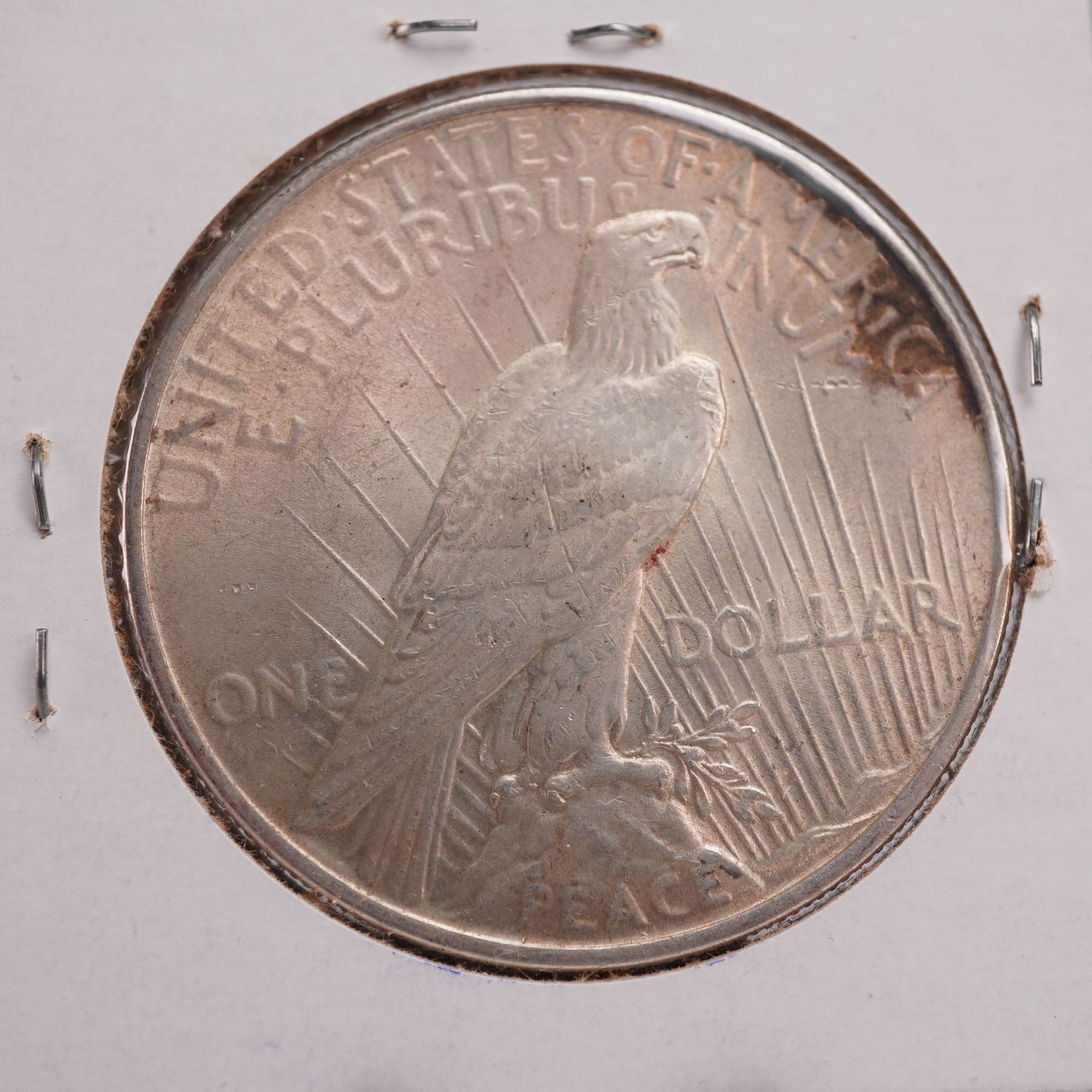 This Peace Silver Dollar is crafted from an alloy of 90% silver and 10% copper, minted in 1924. The obverse, showcases the allegorical figure of Liberty in profile, crowned with radiating spikes reminiscent of a classical tiara. The inscriptions LIBERTY and IN GOD WE TRVST adorned in raised letters along with the date at the bottom of the truncation. The reverse depicts a powerful bald eagle resting upon a mountaintop, grasping an olive branch in its talons, framed by the ascending rays of the sun and surrounded by the inscriptions UNITED STATES OF AMERICA, E PLURIBUS UNUM, and ONE DOLLAR. The word PEACE is prominently displayed at the base. Enclosed in a cardboard holder. Holder measures: 2"L x 2"H. Coin diameter: 38.1 mm.