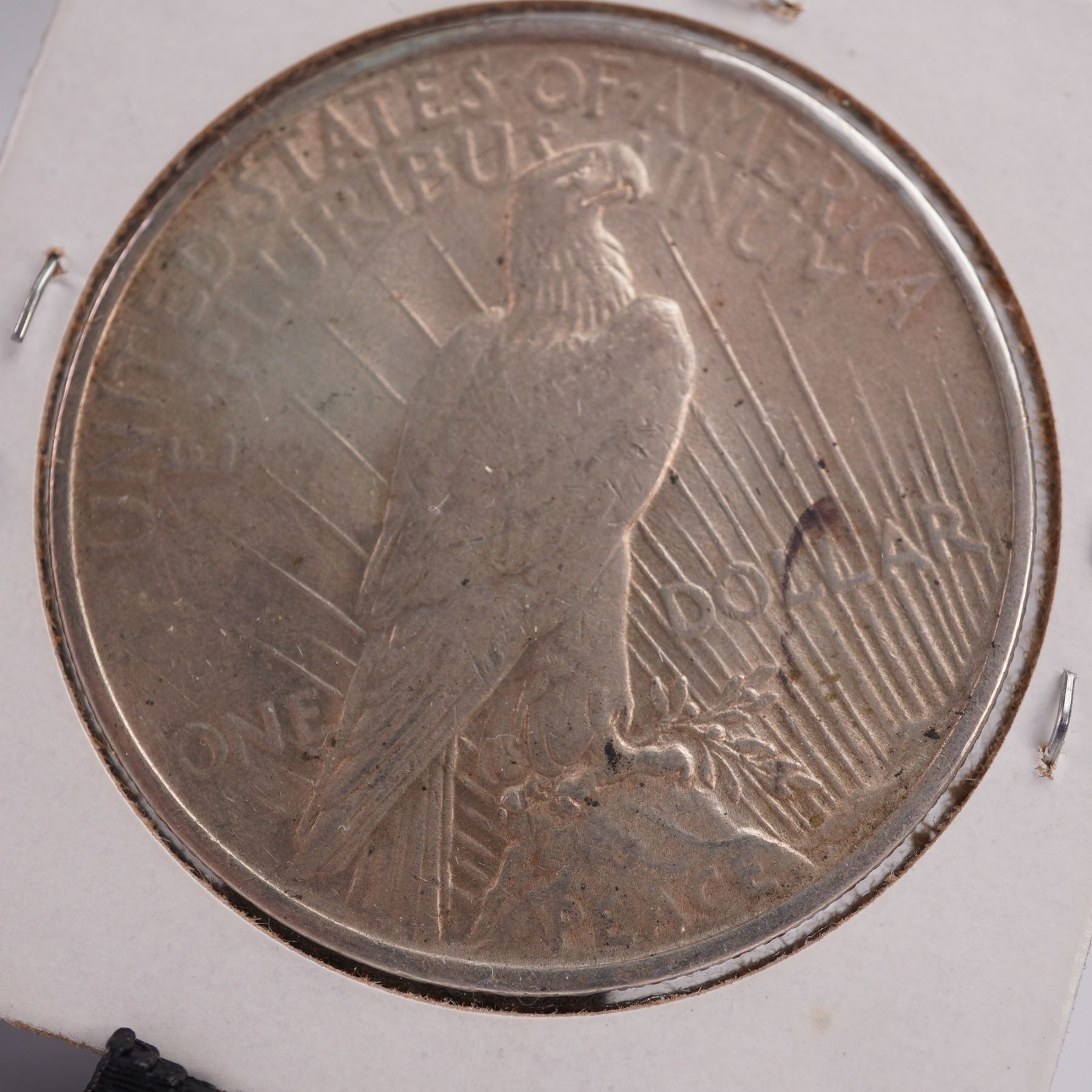 A 1924 Peace Silver Dollar struck in 90% silver. The obverse features the iconic left-facing profile of Lady Liberty adorned with a radiant tiara on the obverse, accompanied by the inscriptions LIBERTY, IN GOD WE TRVST, and the date 1924 arranged in classical composition. The reverse reveals an American bald eagle perched majestically upon a rock clutching an olive branch, symbolizing peace, against a backdrop of sun rays, with the inscriptions UNITED STATES OF AMERICA, E PLURIBUS UNUM, ONE DOLLAR, and PEACE encircling the patriotic motif. Enclosed in a cardboard holder. Holder measures: 2"L x 2"H. Coin diameter: 38.1 mm.