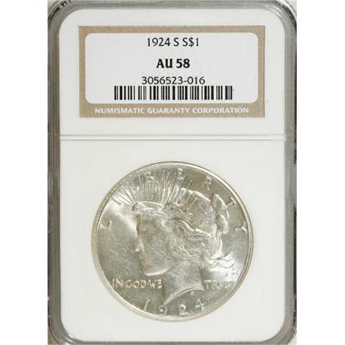 <B>1924-S $1 AU58 NGC.</B></I> . NGC Census: (243/2082). PCGS Population (256/3032). Mintage: 1,728,000. Numismedia Wsl. Price for NGC/PCGS coin in AU58: $110. (#7364)<BR><BR><B>Coin Engraver:</B> Anthony de Francisci<BR><BR><b>Shipping:</b> Coins & Currency (<a target="_blank" href="http://www.heritageauctions.com/common/shipping.php">view shipping information</a>)