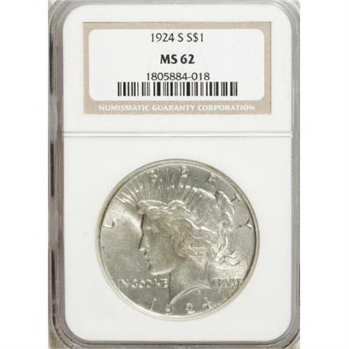 <B>1924-S $1 MS62 NGC.</B></I> NGC Census: (449/1409). PCGS Population (564/2243). Mintage: 1,728,000. Numismedia Wsl. Price for NGC/PCGS coin in MS62: $258. (#7364)<BR><BR><B>Coin Engraver:</B> Anthony de Francisci<BR><BR><b>Shipping:</b> Coins & Currency (<a target="_blank" href="http://www.heritageauctions.com/common/shipping.php">view shipping information</a>)