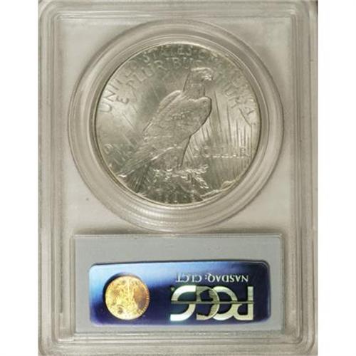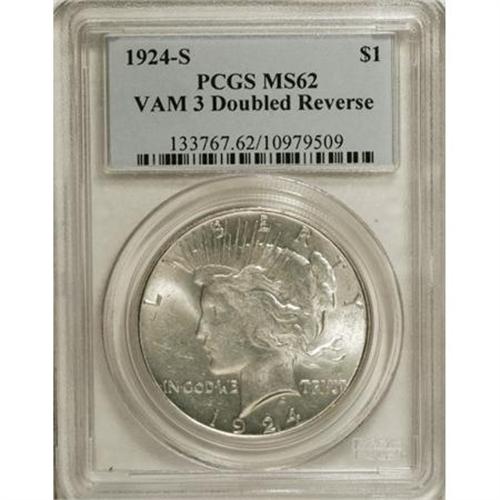 <B>1924-S $1 MS62 PCGS.</B></I> VAM-3. A Top 50 Variety. The only Top 50 variety for this low-mintage issue, the "Doubled Reverse" exhibits spread on the lower feather tips and the olive berries. Though this piece is lightly abraded overall with splashes of milky patina, the luster is strong, and the reverse has stronger detail than usual. Population: 1 in 62, 1 finer (4/07).<BR><BR><b>Shipping:</b> Coins & Currency (<a target="_blank" href="http://www.heritageauctions.com/common/shipping.php">view shipping information</a>)