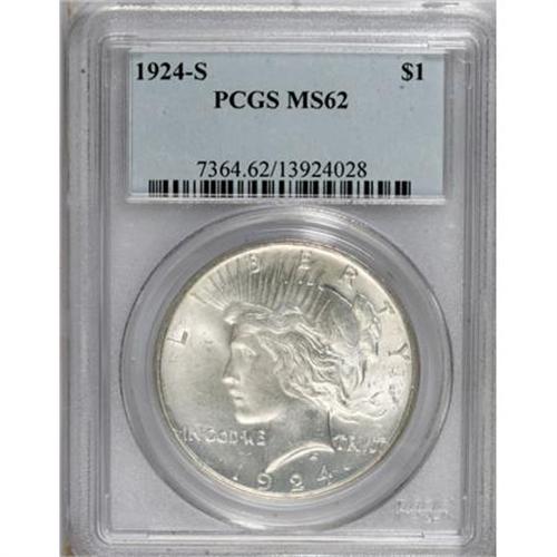 <B>1924-S $1 MS62 PCGS.</B></I> PCGS Population (561/2223). NGC Census: (439/1386). Mintage: 1,728,000. Numismedia Wsl. Price for NGC/PCGS coin in MS62: $258. (#7364)<BR><BR><B>Coin Engraver:</B> Anthony de Francisci<BR><BR><b>Shipping:</b> Coins & Currency (<a target="_blank" href="http://www.heritageauctions.com/common/shipping.php">view shipping information</a>)
