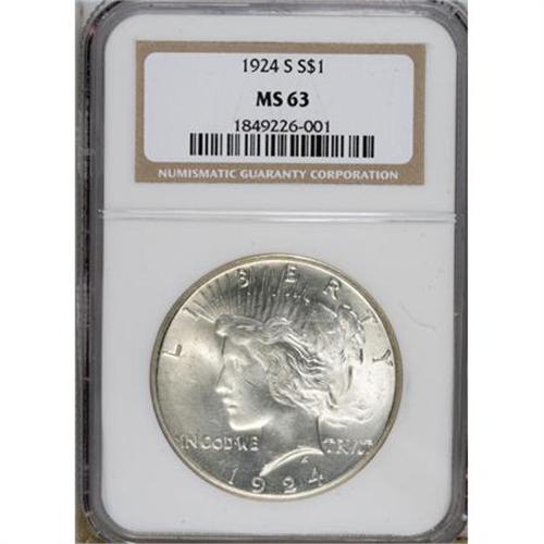 <B>1924-S $1 MS63 NGC.</B></I> NGC Census: (585/768). PCGS Population (1093/1004). Mintage: 1,728,000. Numismedia Wsl. Price for NGC/PCGS coin in MS63: $520. (#7364)<BR><BR><b>Shipping:</b> Coins & Currency (<a target="_blank" href="http://www.heritageauctions.com/common/shipping.php">view shipping information</a>)