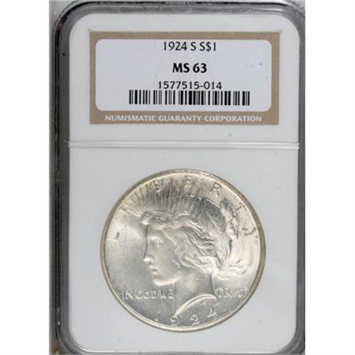 <B>1924-S $1 MS63 NGC.</B></I> NGC Census: (610/794). PCGS Population (1116/1113). Mintage: 1,728,000. Numismedia Wsl. Price for NGC/PCGS coin in MS63: $520. (#7364)<BR><BR><B>Coin Engraver:</B> Anthony de Francisci<BR><BR><b>Shipping:</b> Coins & Currency (<a target="_blank" href="http://www.heritageauctions.com/common/shipping.php">view shipping information</a>)