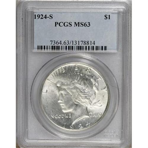<B>1924-S $1 MS63 PCGS.</B></I> PCGS Population (1103/1051). NGC Census: (593/783). Mintage: 1,728,000. Numismedia Wsl. Price for NGC/PCGS coin in MS63: $520. (#7364)<BR><BR><B>Coin Engraver:</B> Anthony de Francisci<BR><BR><b>Shipping:</b> Coins & Currency (<a target="_blank" href="http://www.heritageauctions.com/common/shipping.php">view shipping information</a>)