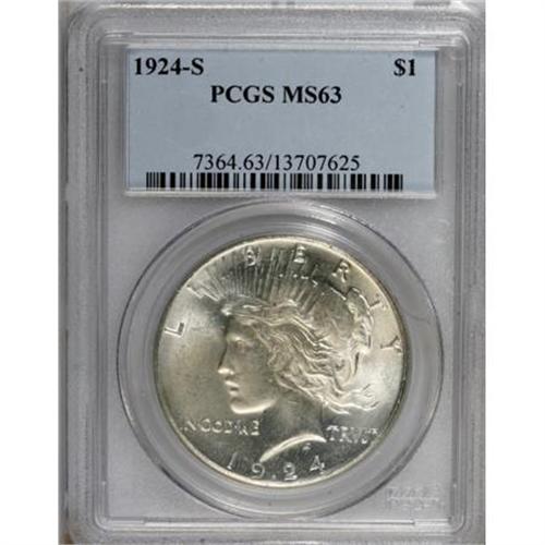 <B>1924-S $1 MS63 PCGS.</B></I> PCGS Population (1111/1086). NGC Census: (600/786). Mintage: 1,728,000. Numismedia Wsl. Price for NGC/PCGS coin in MS63: $520. (#7364)<BR><BR><B>Coin Engraver:</B> Anthony de Francisci<BR><BR><b>Shipping:</b> Coins & Currency (<a target="_blank" href="http://www.heritageauctions.com/common/shipping.php">view shipping information</a>)