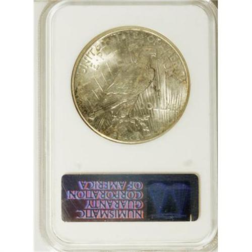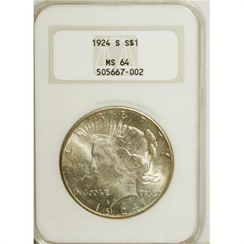 <B>1924-S $1 MS64 NGC.</B></I> Original chestnut-gold and cream-gray toning enriches this lustrous and carefully preserved better-date near-Gem. Housed in a prior generation holder, which has a small chip on the lower right corner with no impact on the coin itself.<BR><BR><b>Shipping:</b> Coins & Currency (<a target="_blank" href="http://www.heritageauctions.com/common/shipping.php">view shipping information</a>)