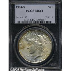 <B>1924-S<img border='0' src='http://www.heritagecoins.com/images/star.gif' width=10 height=10>$1 MS64 PCGS.</B></I> Lustrous surfaces are visited by splashes of gold-brown color, especially on the obverse. A few grade-defining marks are apparent on Liberty's cheek and on the eagle.