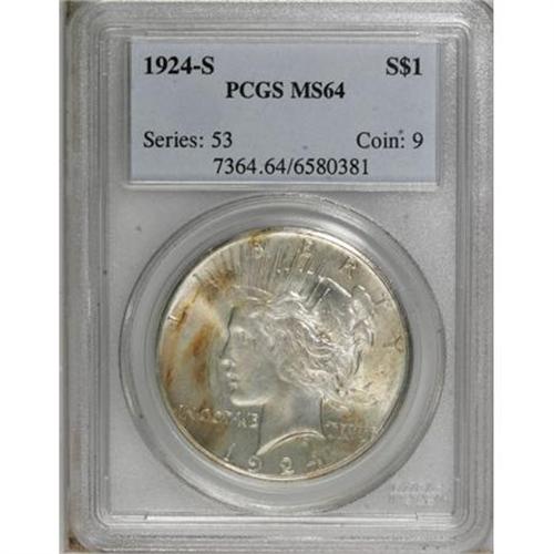 <B>1924-S $1 MS64 PCGS.</B></I> The obverse has delightful golden-brown, ice-blue, and lime-green toning. The reverse has lighter streaks of sky-blue and olive-tan. Lustrous and suitably struck with pleasing preservation.<BR><BR><b>Shipping:</b> Coins & Currency (<a target="_blank" href="http://www.heritageauctions.com/common/shipping.php">view shipping information</a>)