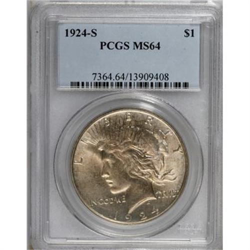 <B>1924-S $1 MS64 PCGS.</B></I> Flashy luster and delicate silver-blue patina are two of the most enticing attributes of this lovely near-Gem. Solidly struck for this S-mint issue with only a handful of small, grade-defining flaws.<BR><BR><B>Coin Engraver:</B> Anthony de Francisci<BR><BR><b>Shipping:</b> Coins & Currency (<a target="_blank" href="http://www.heritageauctions.com/common/shipping.php">view shipping information</a>)