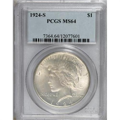 <B>1924-S $1 MS64 PCGS.</B></I> A well-defined example of this popular Peace issue, softly lustrous with a touch of satin to the gold-tinged surfaces. Gem examples of this San Francisco issue are elusive, with just 72 pieces graded MS65 or better by PCGS (10/07).<BR><BR><B>Coin Engraver:</B> Anthony de Francisci<BR><BR><b>Shipping:</b> Coins & Currency (<a target="_blank" href="http://www.heritageauctions.com/common/shipping.php">view shipping information</a>)