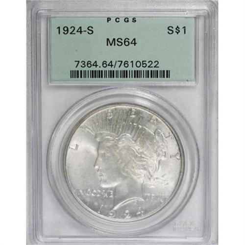 <B>1924-S $1 MS64 PCGS.</B></I> A lustrous near-Gem with attractive apricot color and a good strike. A nicely preserved example of this scarce low mintage issue. In a green label holder.<BR><BR><B>Coin Engraver:</B> Anthony de Francisci<BR><BR><b>Shipping:</b> Coins & Currency (<a target="_blank" href="http://www.heritageauctions.com/common/shipping.php">view shipping information</a>)