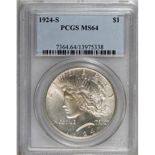<B>1924-S $1 MS64 PCGS.</B></I> This highly lustrous near-Gem is almost completely white, except for tiny speckles of gold on the upper obverse. Well-defined for the issue with only a few light abrasions on each side. <BR><BR><B>Coin Engraver:</B> Anthony de Francisci<BR><BR><b>Shipping:</b> Coins & Currency (<a target="_blank" href="http://www.heritageauctions.com/common/shipping.php">view shipping information</a>)