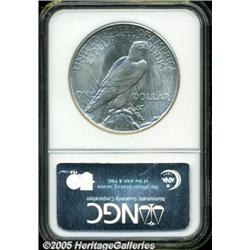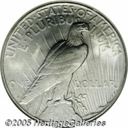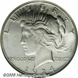 <B>1924-S<img border='0' src='http://www.heritagecoins.com/images/star.gif' width=10 height=10>$1 MS65 NGC.</B></I> Several different Peace Dollar issues fall into the "condition rarity" category, being common or plentiful dates when all grades are considered, but major rarities above a specific grade level. Such is the case with the 1924-S issue, with its mintage of nearly two million coins. The San Francisco Mint issue 1,728,000 of these coins, but nearly all survivors from this mintage are in grade levels below Gem quality. The NGC Census supports the conditional rarity of this issue. This example is fully brilliant with silvery-white surfaces and satiny luster. Although not fully struck, it is much sharper than most. The present opportunity should be captured by the advanced Peace Dollar collector. Population: 56 in 65, 1 finer (2/05).
