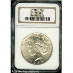 1924 S$1 MS66 NGC. An exquisitely struck premium G <B>1924 S$1 MS66 NGC.</B></I> An exquisitely struck premium Gem, stone-white at first glance although traces of apricot color are also present. A common date, but pieces with the originality and preservation of this lovely example are infrequently encountered. <BR><BR><B>Important notice:</B> Heritage usually auctions material at the rate of 200-250 lots per hour. On some occasions eBay Live bid software or the Internet may not be able to keep up with the pace of the auction. We recommend placing a realistic absentee bid now as insurance to avoid disappointment. Occasionally the auctioneer may eliminate or reject an eBay Live bid, and the auctioneer may also reopen a lot after the close of the eBay live bidding (usually because we missed an audience bid), and may reject your bid even if it shows you as the winning bidder. By bidding via eBay Live, you agree that Heritage may award the lot to another bidder at its sole discretion under the circumstances described above or any other reasonable circumstances. Since eBay bids are not shown to us until we open the lot on the floor, we treat those bids just like floor bids. In most cases the floor responds before the eBay bid is presented to us, due to Internet lag time, so for consistency we have made it a policy that floor bids are always considered first over tie eBay live bids. Also please note that all Heritage lots purchased through eBay Live carry a 20% Buyer's Premium. Please make sure you read the Terms and Conditions before you bid. This lot is being auctioned in conjunction with a live floor auction by Heritage Galleries & Auctioneers. All final auction and invoice information will be supplied by Heritage Galleries & Auctioneers, and all other information should be considered preliminary. Lot:7788