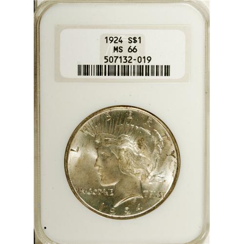 <B>1924 S$1 MS66 NGC.</B></I> Rose, blue, and silver converge on this remarkable Premium Gem. Highly lustrous and suitably struck with hardly any marks on either side.<BR><BR><b>Shipping:</b> Coins & Currency (<a target="_blank" href="http://www.heritageauctions.com/common/shipping.php">view shipping information</a>)