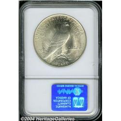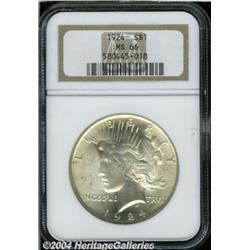 <B>1924<S$1> MS66 NGC.</B></I> A must have for the Peace dollar collector, this example is near-pristine with undulating cartwheel luster and light, golden toned surfaces. <BR><BR><B>Important notice:</B> Heritage usually auctions material at the rate of 200-250 lots per hour. On some occasions eBay Live bid software or the Internet may not be able to keep up with the pace of the auction. We recommend placing a realistic absentee bid now as insurance to avoid disappointment. Occasionally the auctioneer may eliminate or reject an eBay Live bid, and the auctioneer may also reopen a lot after the close of the eBay live bidding (usually because we missed an audience bid), and may reject your bid even if it shows you as the winning bidder. By bidding via eBay Live, you agree that Heritage may award the lot to another bidder at its sole discretion under the circumstances described above or any other reasonable circumstances. Since eBay bids are not shown to us until we open the lot on the floor, we treat those bids just like floor bids. In most cases the floor responds before the eBay bid is presented to us, due to Internet lag time, so for consistency we have made it a policy that floor bids are always considered first over tie eBay live bids. Also please note that all Heritage lots purchased through eBay Live carry a 20% Buyer's Premium. Please make sure you read the Terms and Conditions before you bid. </span></font></tr></table></td></tr></table>