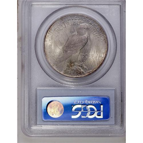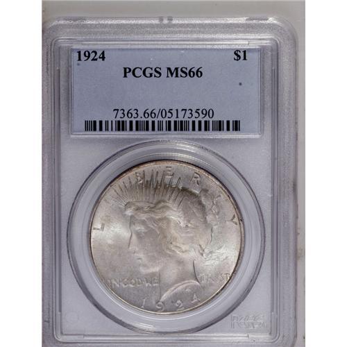 <B>1924<img border='0' src='http://www.heritagecoins.com/images/star.gif' width=10 height=10>$1> MS66 PCGS.</B></I> The beautifully matte-like surfaces display softly frosted luster that illuminates exquisite ice-blue and cream-gray toning. A few small milling marks rest on the back and tail of the eagle.
