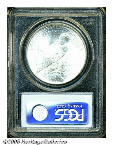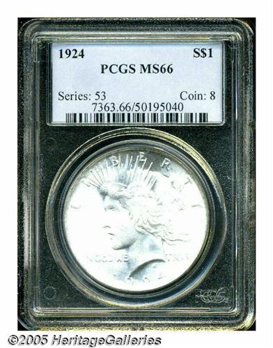 <B>1924<S$1> MS66 PCGS.</B></I> This flashy Peace dollar displays white, matte-like surfaces and sharply struck design elements. A couple of minor scuffs are noted on Liberty's cheek, and a few miniscule contact marks occur on the eagle, but in general this is a well preserved specimen. PCGS has certified only 22 specimens higher (4/05).