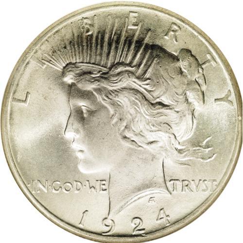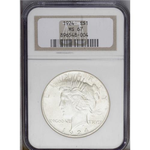 <B>1924<img border='0' src='http://www.heritagecoins.com/images/star.gif' width=10 height=10>$1> MS67 NGC.</B></I> The exceedingly bright, frosty luster that rolls across each side of this flashy Superb Gem is far superior to the typically dull or satiny luster evinced by the vast majority of surviving Peace dollars. The striking characteristics also seem above average on both sides of the piece, even allowing for very minor weakness on some of the lower reverse design elements. Essentially free of noticeable toning, the coin does exhibit a hint of lemon-yellow color in the obverse and reverse fields. As expected for the assigned grade level, this shimmering example is impressively preserved, and the surfaces are nearly pristine. One would be hard-pressed to locate a more pleasing representative of this Philadelphia Mint issue.<BR><I>From The Robert Moreno Registry Collection of Peace Dollars.</B></I>