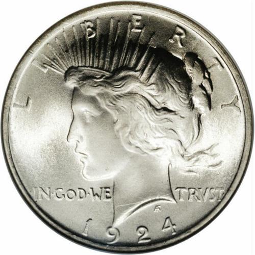 <B>1924<img border='0' src='http://www.heritagecoins.com/images/star.gif' width=10 height=10>$1> MS67 NGC.</B></I> One of the more underrated Peace dollars, especially among Philadelphia issues. This piece is atypical in several respects from the usually encountered '24-P. The striking details leave nothing to be desired with complete design details throughout, even if they are not fully brought up like, say, a '22-P or '23-P. The surfaces are unblemished and covered with smooth, frosty mint luster. Heavy metal flow gives the coin a somewhat granular appearance in the fields which lends an "orange-peel" surface to the coin. An outstanding coin for the finest collection. Census: 47 in 67, 0 finer (4/06).