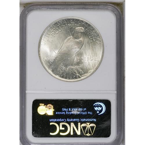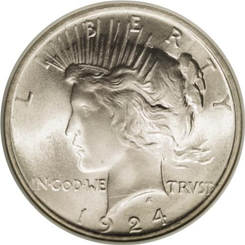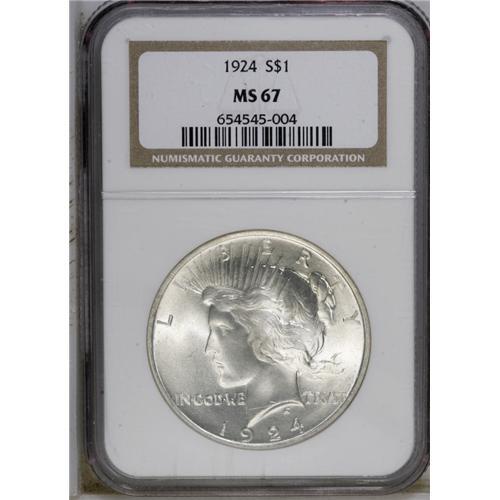 <B>1924<img border='0' src='http://www.heritagecoins.com/images/star.gif' width=10 height=10>$1> MS67 NGC.</B></I> The tawny-gold toning is light on the obverse and more apparent on the reverse. Cartwheel sheen is vigorous, and the devices are intricately impressed. Any incompleteness of strike is limited to a few obverse peripheral letters. Rotation beneath a light locates only a few faint luster grazes on either side. Moderate mint-made die wear lends an interesting 'orange peel' texture. A desirable example of this popular issue, which is less available than the common 1922 and 1923. Census: 49 in 67, 0 finer (9/06).