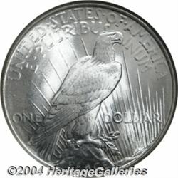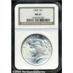 <B>1924<S$1> MS67 NGC.</B></I> One of the more underrated Peace dollars, especially among Philadelphia issues. This piece is atypical in several respects from the usually encountered '24-P. The striking details leave nothing to be desired with complete design details throughout, even if they are not fully brought up like, say, a '22-P or '23-P. The surfaces are unblemished and covered with smooth, frosty mint luster. Heavy metal flow gives the coin a somewhat granular appearance in the fields which lends an "orange-peel" surface to the coin. <BR><BR><B>Important notice:</B> Heritage usually auctions material at the rate of 200-250 lots per hour. On some occasions eBay Live bid software or the Internet may not be able to keep up with the pace of the auction. We recommend placing a realistic absentee bid now as insurance to avoid disappointment. Occasionally the auctioneer may eliminate or reject an eBay Live bid, and the auctioneer may also reopen a lot after the close of the eBay live bidding (usually because we missed an audience bid), and may reject your bid even if it shows you as the winning bidder. By bidding via eBay Live, you agree that Heritage may award the lot to another bidder at its sole discretion under the circumstances described above or any other reasonable circumstances. Since eBay bids are not shown to us until we open the lot on the floor, we treat those bids just like floor bids. In most cases the floor responds before the eBay bid is presented to us, due to Internet lag time, so for consistency we have made it a policy that floor bids are always considered first over tie eBay live bids. Also please note that all Heritage lots purchased through eBay Live carry a 20% Buyer's Premium. Please make sure you read the Terms and Conditions before you bid. </span></font></tr></table></td></tr></table>