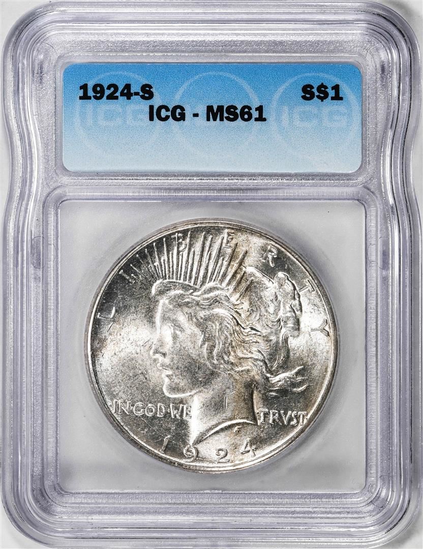 One 1924-S $1 Peace Silver Dollar Coin ICG MS61. ICG Certified.