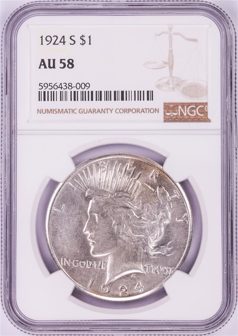 One 1924-S $1 Peace Silver Dollar Coin NGC AU58. NGC Certified.