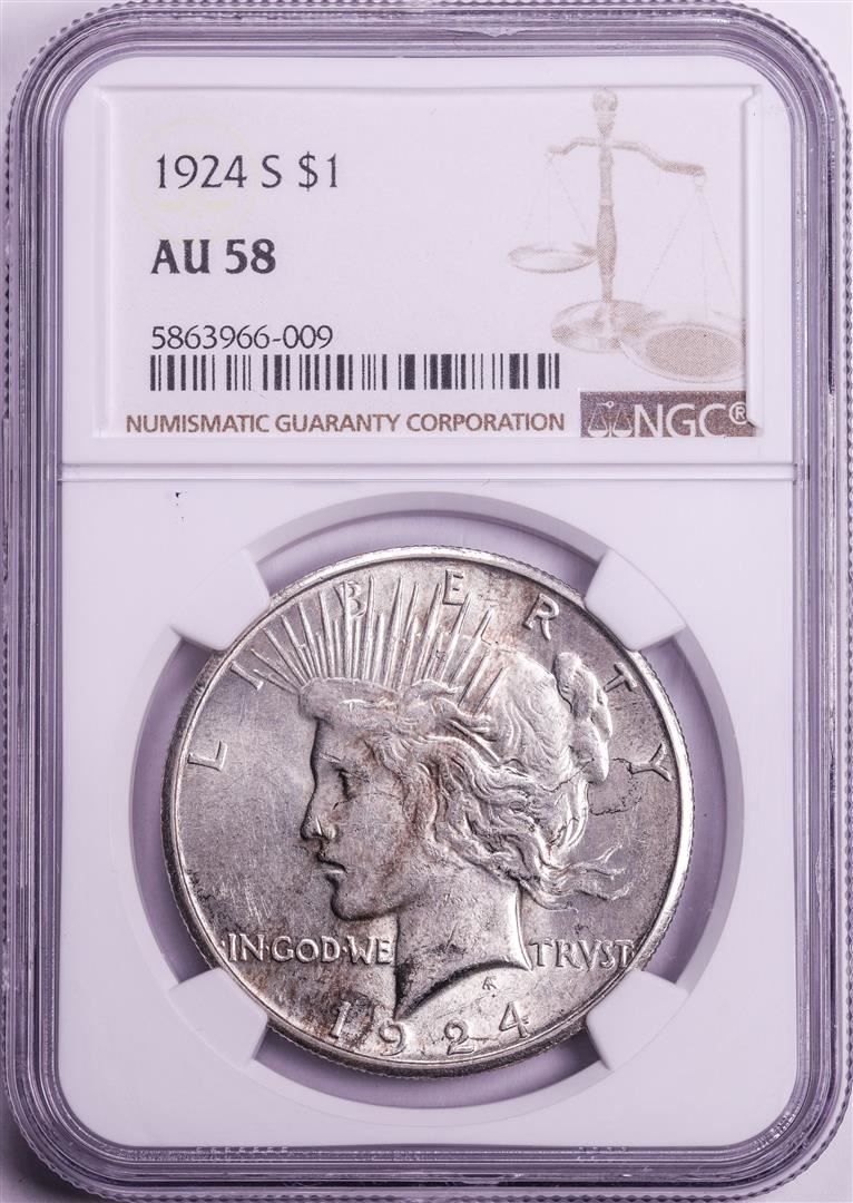 One 1924-S $1 Peace Silver Dollar Coin NGC AU58. NGC Certified.