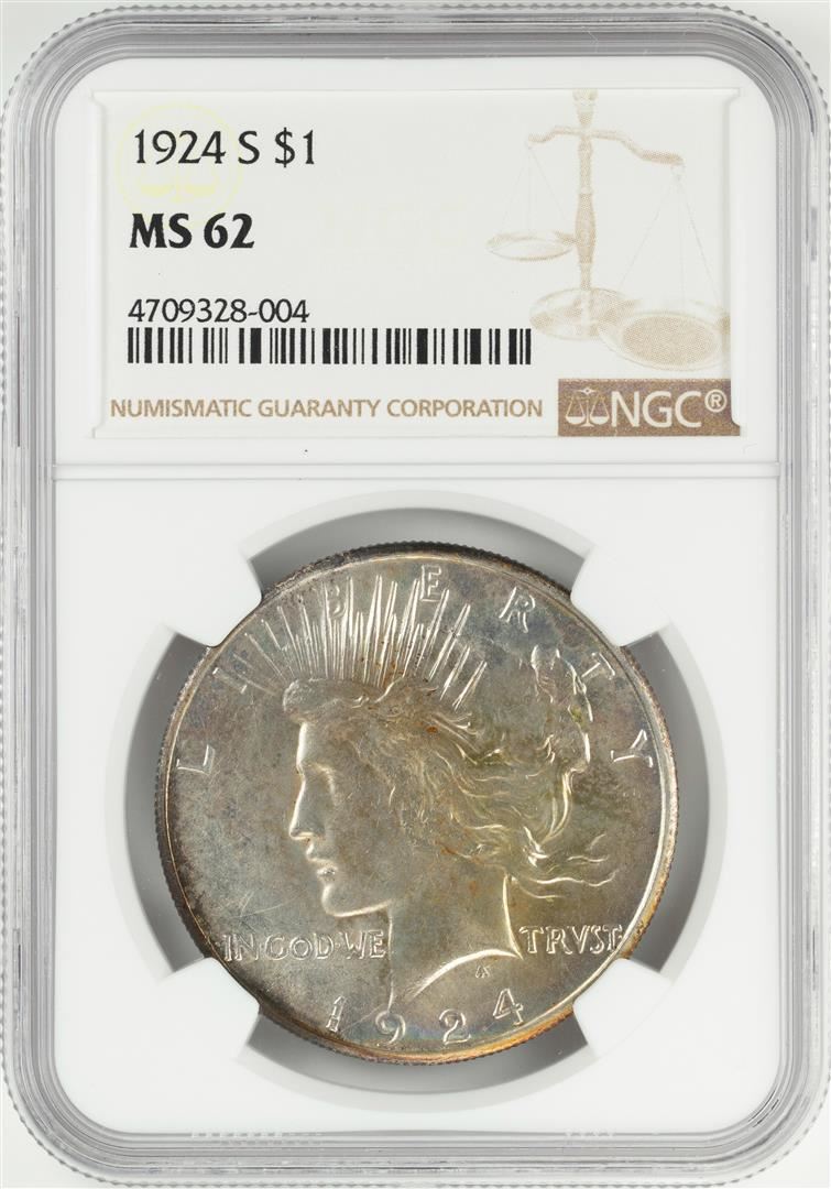 One 1924-S $1 Peace Silver Dollar Coin NGC MS62. NGC Certified.
