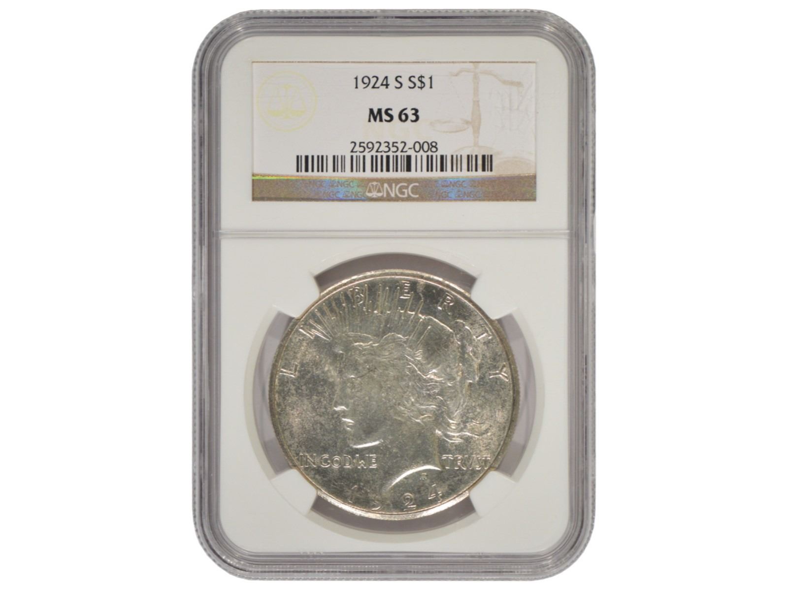 One 1924-S $1 Peace Silver Dollar Coin NGC MS63.