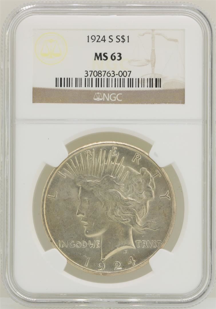 One 1924-S $1 Peace Silver Dollar Coin NGC MS63. NGC Certified.