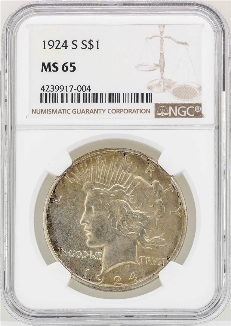 One 1924-S $1 Peace Silver Dollar Coin NGC MS65. NGC Certified.