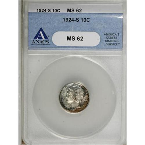 <B>1924-S 10C MS62 ANACS.</B></I> NGC Census: (30/89). PCGS Population (14/97). Mintage: 7,120,000. Numismedia Wsl. Price for NGC/PCGS coin in MS62: $300. (#4946)<BR><BR><B>Coin Engraver:</B> Adolph A. Weinman<BR><BR><b>Shipping:</b> Coins & Currency (<a target="_blank" href="http://www.heritageauctions.com/common/shipping.php">view shipping information</a>)