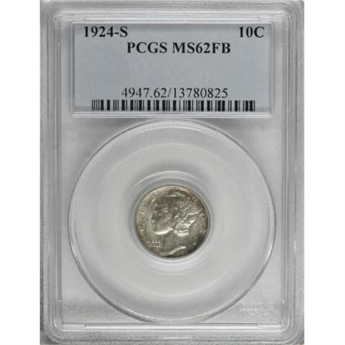 <B>1924-S 10C MS62 Full Bands PCGS.</B></I> Well struck with satin luster and speckled olive, green, and lilac patina near the borders. The central reverse bands are fully detailed. Two or three tiny contact marks are noted on Liberty's face. A conditionally scarce issue in Mint State, especially with Full Bands. <BR><BR><B>Coin Engraver:</B> Adolph A. Weinman<BR><BR><b>Shipping:</b> Coins & Currency (<a target="_blank" href="http://www.heritageauctions.com/common/shipping.php">view shipping information</a>)