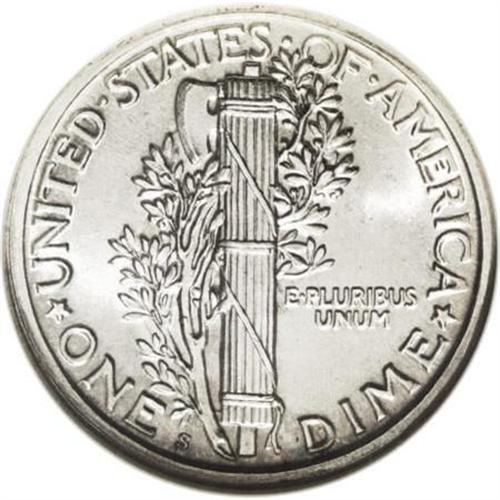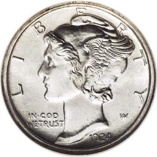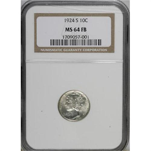 <B>1924-S 10C MS64 Full Bands NGC.</B></I> This is a pretty, silver-gold near-Gem coin of this difficult issue, one generally struck from tired, fatigued, overused dies. This piece does show some orange-peel effect and clashing in the fields, evidence of the foregoing, but there is little in the way of postproduction contact save for a couple of tiny ticks at the bust truncation. NGC has certified only six Full Bands pieces finer (3/08).<BR><BR><B>Coin Engraver:</B> Adolph A. Weinman<BR><BR><b>Shipping:</b> Coins & Currency (<a target="_blank" href="http://www.heritageauctions.com/common/shipping.php">view shipping information</a>)