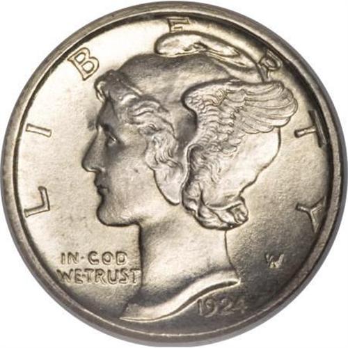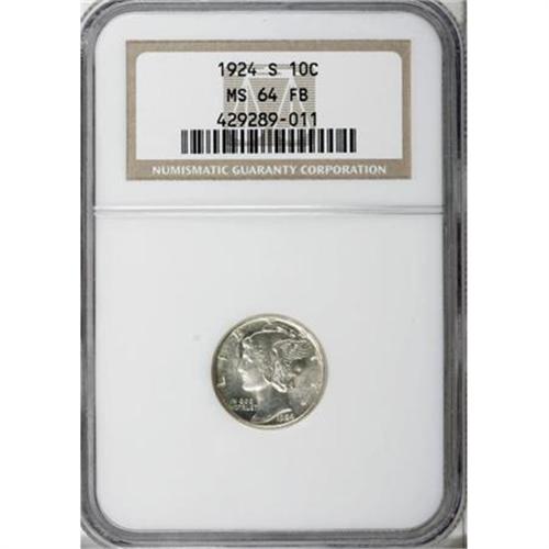 <B>1924-S 10C MS64 Full Bands NGC.</B></I> The frosty surfaces of this charming near-Gem are an unusual but attractive greenish-gold color, with few distractions. A moderate amount of "die burn" is noted around the upper portrait of Liberty, a term Lange uses to describe die overpolishing, a phenomenon especially prevalent during the 1920s. A couple of tiny ticks on Liberty's cheek and neck prevent a finer grade, but this specimen offers generous eye appeal. NGC has certified only six Full Bands pieces finer (3/08).<BR><BR><B>Coin Engraver:</B> Adolph A. Weinman<BR><BR><b>Shipping:</b> Coins & Currency (<a target="_blank" href="http://www.heritageauctions.com/common/shipping.php">view shipping information</a>)