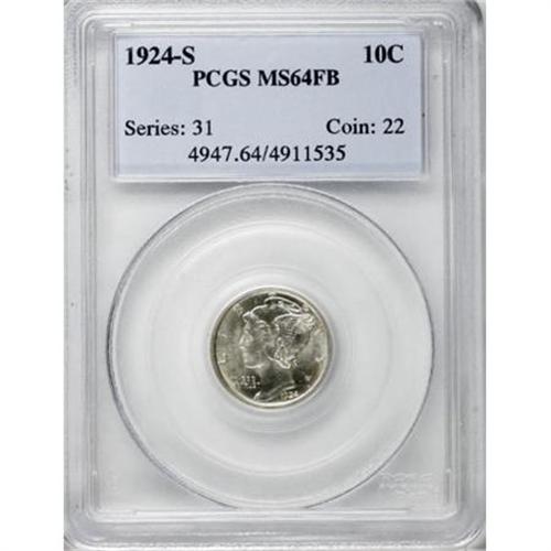 <B>1924-S 10C MS64 Full Bands PCGS.</B></I> This is a splendid near-Gem example with sharp design features, including full central band details on the reverse. Each side has frosty silver luster with minimal toning other than a faint golden cast on the obverse and a few freckles of reddish-tan patina on the reverse fields. <BR><BR><B>Coin Engraver:</B> Adolph A. Weinman<BR><BR><b>Shipping:</b> Coins & Currency (<a target="_blank" href="http://www.heritageauctions.com/common/shipping.php">view shipping information</a>)