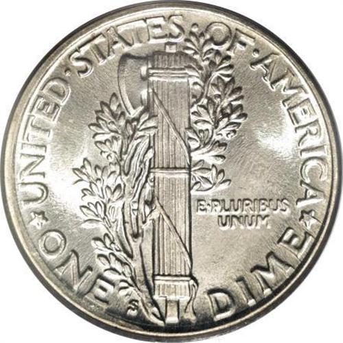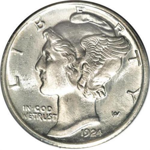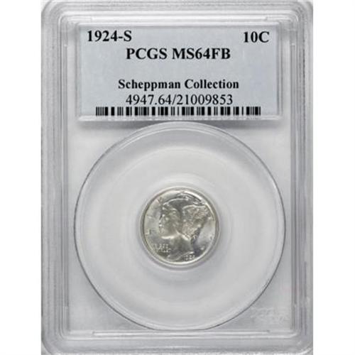 <B>1924-S 10C MS64 Full Bands PCGS.</B></I> Subtle golden tints visit the otherwise silver-white surfaces of this charming near-Gem. The strike is surprisingly bold for this 1920s S-mint issue, and the overall visual appeal is powerful despite a handful of wispy, isolated flaws. PCGS has certified a mere 16 finer representatives (12/07).<BR><I>From The Scheppman Collection, #4 PCGS Registry of Full Band Mercury Dimes.</B></I><BR><BR><B>Coin Engraver:</B> Adolph A. Weinman<BR><BR><b>Shipping:</b> Coins & Currency (<a target="_blank" href="http://www.heritageauctions.com/common/shipping.php">view shipping information</a>)