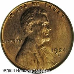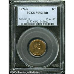 1924-S 1C MS64 Red PCGS. While the mintage of more <B>1924-S 1C MS64 Red PCGS.</B></I> While the mintage of more than 11 million pieces assures that circulated and even lower grade Uncirculated coins are available to the collector, high grade Mint State examples are seldom seen. This is especially true of full red coins. Only 68 pieces have been graded MS64 by PCGS with a paltry eight coins finer (11/04). The surfaces on this piece are bright and satiny with full red mint luster on each side. The striking definition is par for branch mint coinage from the 1920s, which is to say not full, and not comparable to the detailing seen on cents from the teens or the 1930s. Nevertheless, each side is remarkably free from abrasions with only a few tiny specks of carbon on the reverse. <BR><BR><B>Important notice:</B> Heritage usually auctions material at the rate of 200-250 lots per hour. On some occasions eBay Live bid software or the Internet may not be able to keep up with the pace of the auction. We recommend placing a realistic absentee bid now as insurance to avoid disappointment. Occasionally the auctioneer may eliminate or reject an eBay Live bid, and the auctioneer may also reopen a lot after the close of the eBay live bidding (usually because we missed an audience bid), and may reject your bid even if it shows you as the winning bidder. By bidding via eBay Live, you agree that Heritage may award the lot to another bidder at its sole discretion under the circumstances described above or any other reasonable circumstances. Since eBay bids are not shown to us until we open the lot on the floor, we treat those bids just like floor bids. In most cases the floor responds before the eBay bid is presented to us, due to Internet lag time, so for consistency we have made it a policy that floor bids are always considered first over tie eBay live bids. Also please note that all Heritage lots purchased through eBay Live carry a 20% Buyer's Premium. Please make sure you read the Terms and Conditions before you bid. This lot is being auctioned in conjunction with a live floor auction by Heritage Galleries & Auctioneers. All final auction and invoice information will be supplied by Heritage Galleries & Auctioneers, and all other information should be considered preliminary. Lot:5296