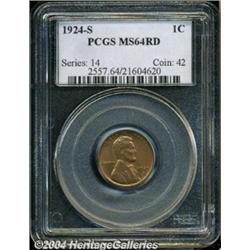 <B>1924-S<1C> MS64 Red PCGS.</B></I> The '24-S is one of the more underrated condition rarities in the Lincoln cent series and, unlike this sharply defined example, most often comes with a noticeable striking deficiency. The surfaces here are vibrant and original, with only a sprinkling of carbon flecks that precludes a possible Gem rating. Population: 63 in 64, 8 finer (7/04). <BR><BR><B>Important notice:</B> Heritage usually auctions material at the rate of 200-250 lots per hour. On some occasions eBay Live bid software or the Internet may not be able to keep up with the pace of the auction. We recommend placing a realistic absentee bid now as insurance to avoid disappointment. Occasionally the auctioneer may eliminate or reject an eBay Live bid, and the auctioneer may also reopen a lot after the close of the eBay live bidding (usually because we missed an audience bid), and may reject your bid even if it shows you as the winning bidder. By bidding via eBay Live, you agree that Heritage may award the lot to another bidder at its sole discretion under the circumstances described above or any other reasonable circumstances. Since eBay bids are not shown to us until we open the lot on the floor, we treat those bids just like floor bids. In most cases the floor responds before the eBay bid is presented to us, due to Internet lag time, so for consistency we have made it a policy that floor bids are always considered first over tie eBay live bids. Also please note that all Heritage lots purchased through eBay Live carry a 20% Buyer's Premium. Please make sure you read the Terms and Conditions before you bid. </span></font></tr></table></td></tr></table>