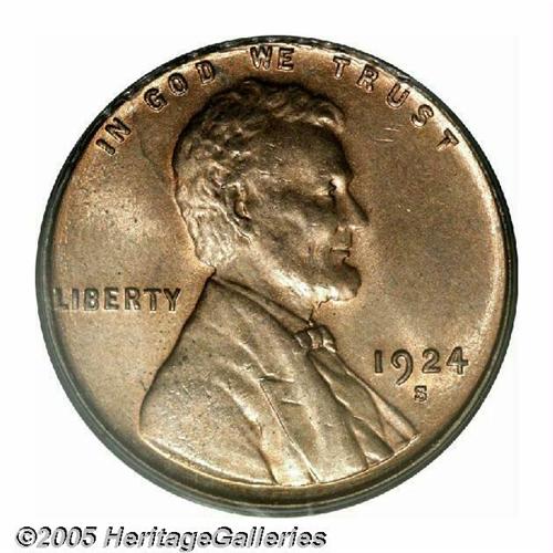 <B>1924-S<1C> MS65 Red PCGS.</B></I> The 1924-S is another of the significant strike rarities from this decade originating at the branch Mint in California. From a reduced mintage of just under 11.7 million pieces, Mint State coins of any grade are difficult to come by and well struck, original Red examples are "scarce as hen's teeth." Offered here is one of the few Gem Red 1924-S Cents yet certified. The surfaces exhibit beautiful sunset-orange accents and are uncommonly bold for the issue. A few flecks of carbon on Lincoln's shoulder only verify the originality of this high quality representative. Based on population figures, unimprovable quality for one of the most challenging Lincoln issues in the entire series. Population: 8 in 65, 0 finer (3/05).<BR><I>From The Tom Mershon #2 All-Time PCGS Registry Set of Lincoln Wheat Cents.</B></I>