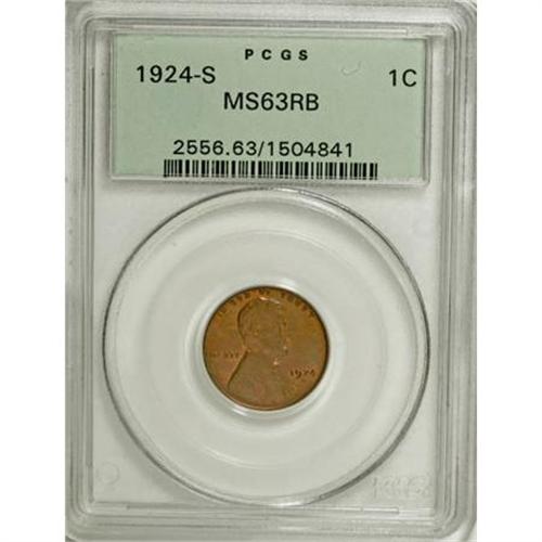<B>1924-S 1C MS63 Red and Brown PCGS.</B></I> PCGS Population (85/168). NGC Census: (37/75). Mintage: 11,696,000. Numismedia Wsl. Price for NGC/PCGS coin in MS63: $192. (#2556)<BR><BR><B>Coin Engraver:</B> Victor D. Brenner<BR><BR><b>Shipping:</b> Coins & Currency (<a target="_blank" href="http://www.heritageauctions.com/common/shipping.php">view shipping information</a>)