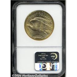 <B>1924-S<$20> MS62 NGC.</B></I> Once considered possibly the rarest $20 Saint Gaudens, discovery of some small hoards in Europe has led it to its more proper designation as scarce. Rich yellow-gold color characterizes this example of this scarcely seen S-mint Saint. The surfaces display a few small, scattered abrasions, as one would expect for a coin of this grade, and the strike is sufficiently strong with no areas of weakness noted. <BR><BR><B>Important notice:</B> Heritage usually auctions material at the rate of 200-250 lots per hour. On some occasions eBay Live bid software or the Internet may not be able to keep up with the pace of the auction. We recommend placing a realistic absentee bid now as insurance to avoid disappointment. Occasionally the auctioneer may eliminate or reject an eBay Live bid, and the auctioneer may also reopen a lot after the close of the eBay live bidding (usually because we missed an audience bid), and may reject your bid even if it shows you as the winning bidder. By bidding via eBay Live, you agree that Heritage may award the lot to another bidder at its sole discretion under the circumstances described above or any other reasonable circumstances. Since eBay bids are not shown to us until we open the lot on the floor, we treat those bids just like floor bids. In most cases the floor responds before the eBay bid is presented to us, due to Internet lag time, so for consistency we have made it a policy that floor bids are always considered first over tie eBay live bids. Also please note that all Heritage lots purchased through eBay Live carry a 20% Buyer's Premium. Please make sure you read the Terms and Conditions before you bid.