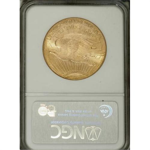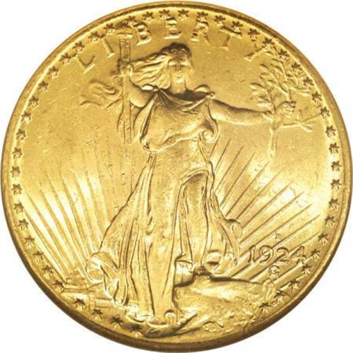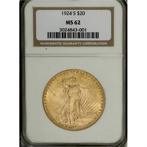 <B>1924-S $20 MS62 NGC.</B></I> Even surface "chatter" is seen on both sides, with no mark worthy of individual mention. While the cumulative effect of the abrasions limit the grade, the luster is full and the color is rich and even. A high-end representative for the grade. European holdings have thankfully made this issue more available to collectors today, but it is by no means a common coin. <BR><BR><B>Coin Engraver:</B> Augustus Saint-Gaudens<BR><BR><b>Shipping:</b> Coins & Currency (<a target="_blank" href="http://www.heritageauctions.com/common/shipping.php">view shipping information</a>)
